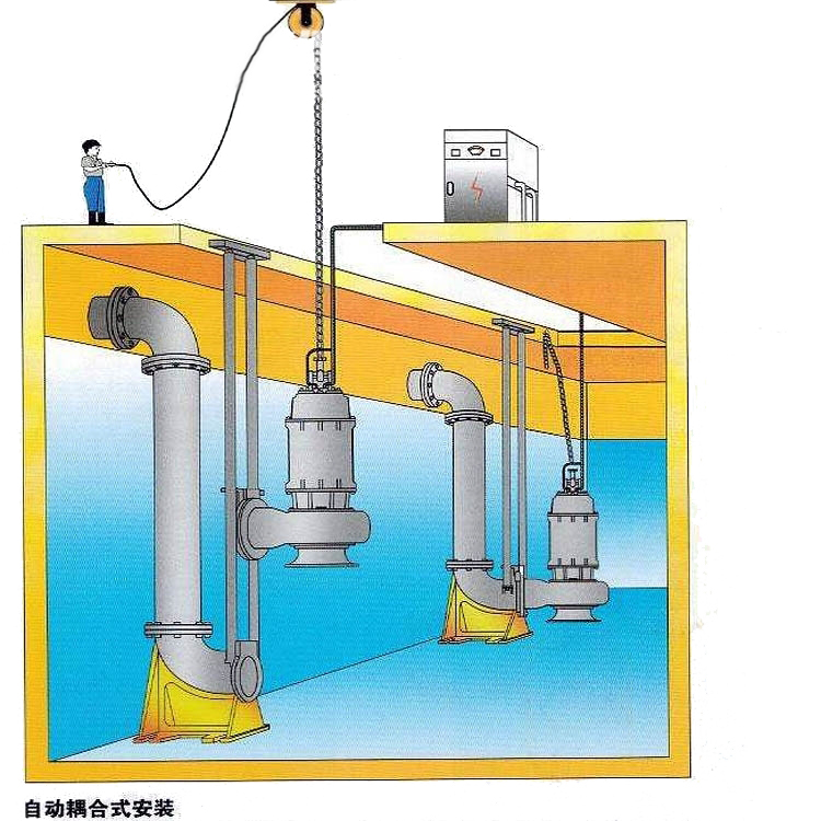 这种耦合方式便于水泵的维修,污水的杂质由于太多,水泵不定期有卡住叶轮、过热、腐蚀等原因造成的损坏,可以通过耦合快速的更换水泵,也避免人员下到污水井内更换。