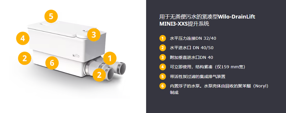 节省空间、可立即使用的提升系统,用于单个房间的污水排放,可以排放来自座便器、淋浴、洗碗机、洗衣机和地下室厨房的污水。